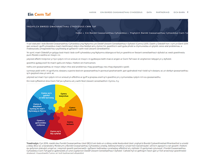 Cefnogir a gynhelir, yn ogystal â datblygu Ein Cwm Taf, gan Data Cymru, mewn cydweithrediad â'r Bwrdd Gwasanaethau Cyhoeddus Cwm Taf. Mae’n cynnig cyfle i bartneriaid a dinasyddion ymgysylltu â’r bwrdd a deall ei rôl allweddol yn well wrth iddo ddatblygu. Mae Ein Cwm Taf hefyd yn cynnwys cyfoeth o wybodaeth am y rhanbarth. Mae'r wefan yn adnodd hanfodol ar gyfer ymarferwyr er mwyn eu cynorthwyo yn y monitro parhaus o amrywiaeth eang o setiau data er mwyn nodi beth ddylai blaenoriaethau ar gyfer ffocws fod hefyd.